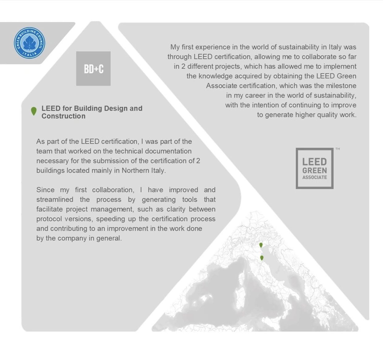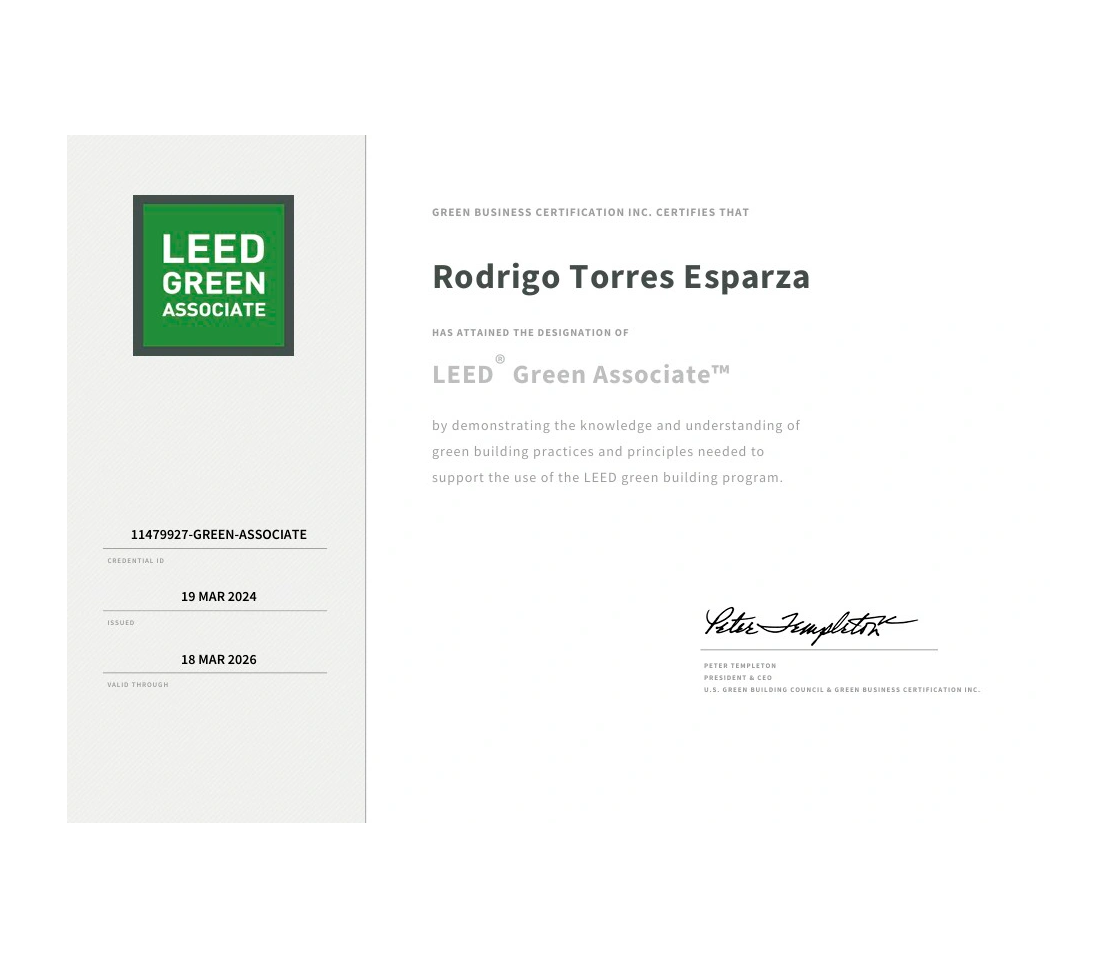 Within the LEED certification standard, I have contributed to the certification of new buildings, which helped me to acquire LEED Green Associate certification. My short-medium term goals also include obtaining LEED AP certification.